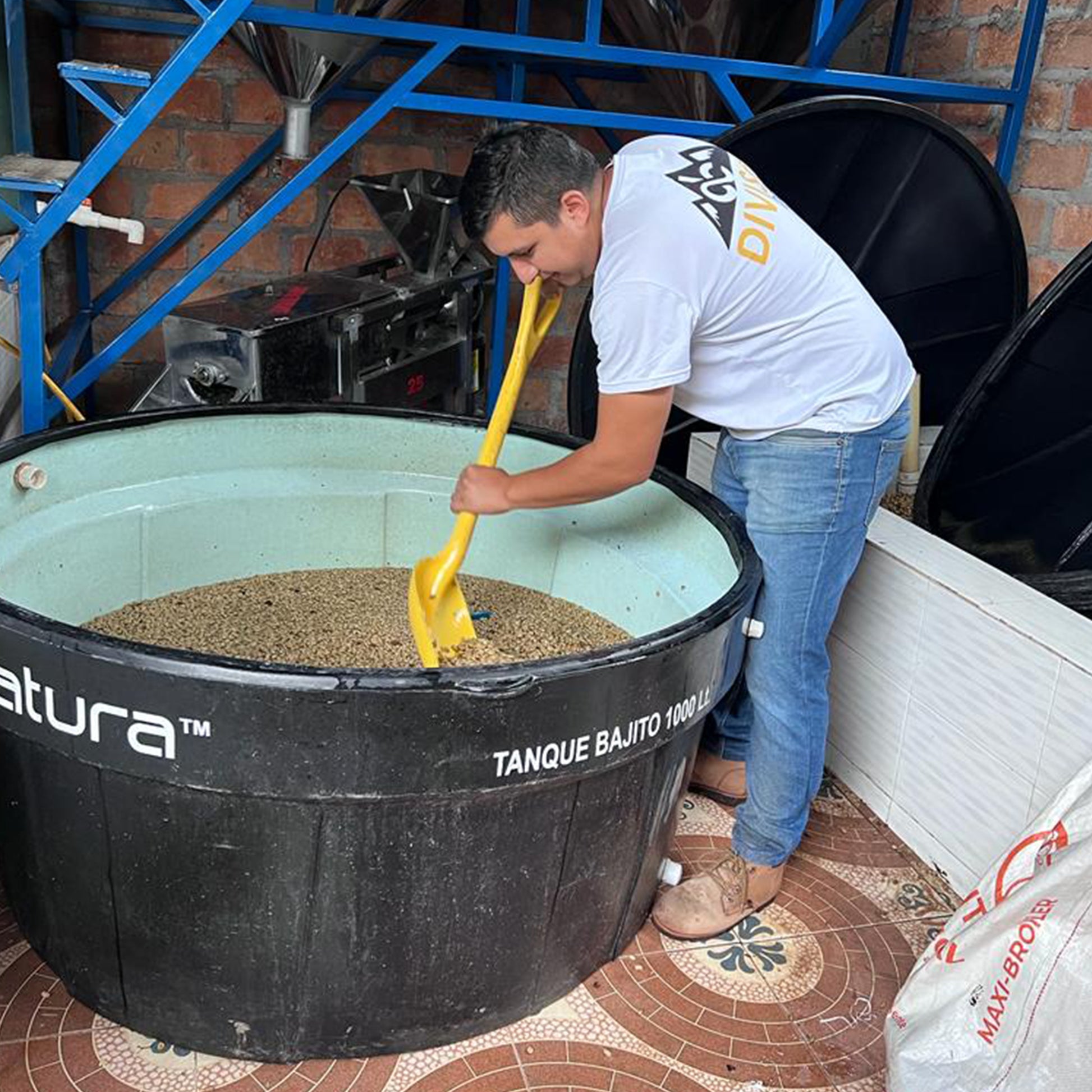 The meticulous natural processing begins with cherries picked at optimal ripeness, boasting Brix degrees between 21-24. The cherries undergo a 48-hour open-air oxidation, during which the coffee must is constantly recirculated and monitored to maintain specific Brix and pH levels. A selective washing and thermal shock rinse at 50°C initiate fermentation, after which the cherries are transferred to airtight tanks with introduced brewer's yeast. A controlled 38-hour anaerobic fermentation ensues, enhancing the coffee's complexity and depth. The beans are then mechanically dried, stabilised, and finally sun-dried in marquesinas for approximately 15 days to achieve the ideal moisture content.